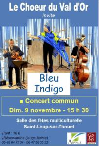 Notez bien la date dans vos agendas ! Le Chœur du Val d’Or invite le spectacle « Bleu Indigo » pour un Concer